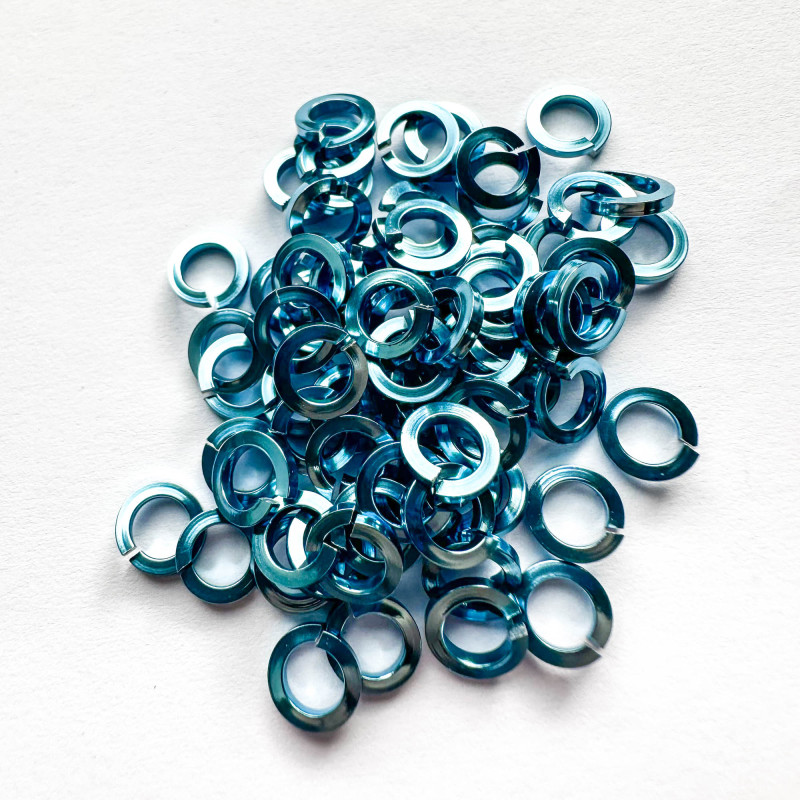 Spojovací kroužky z eloxovaného hliníku světle modré barvy. Řez drátem je čtvercový.