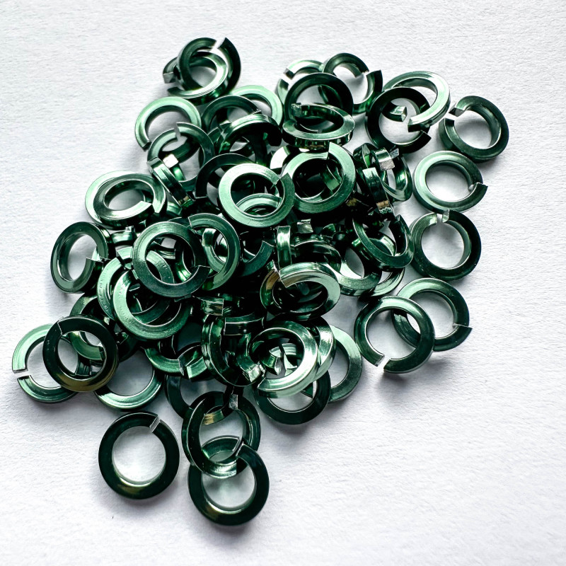 Spojovací kroužky z eloxovaného hliníku zelené barvy. Řez drátem je čtvercový.