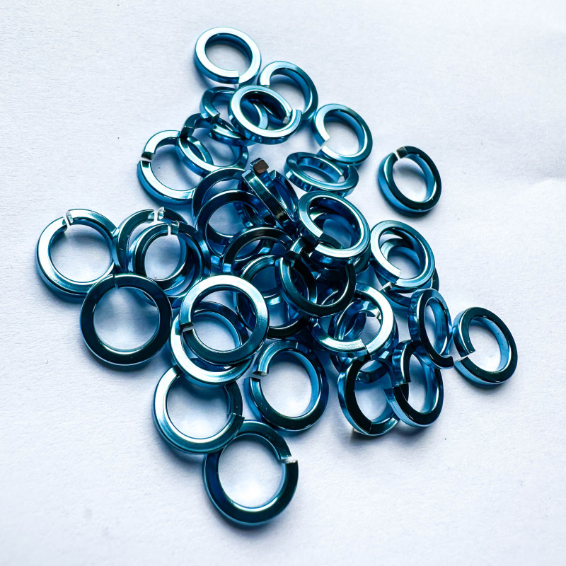 Spojovací kroužky z eloxovaného hliníku světle modré barvy. Řez drátem je čtvercový.