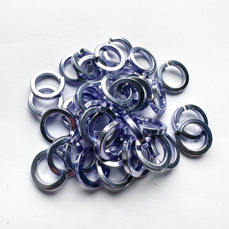 Spojovací kroužky z eloxovaného hliníku světle fialové barvy. Řez drátem je čtvercový. Tyto kroužky jsou velice lesklé a díky tvaru drátu se blýskají více než kroužky z klasického drátu.