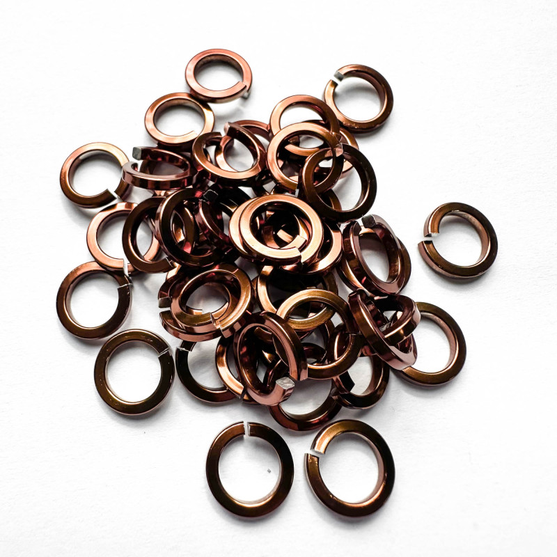 Spojovací kroužky z eloxovaného hliníku hnědé barvy. Řez drátem je čtvercový. Tyto kroužky jsou velice lesklé a díky tvaru drátu se blýskají více než kroužky z klasického drátu.