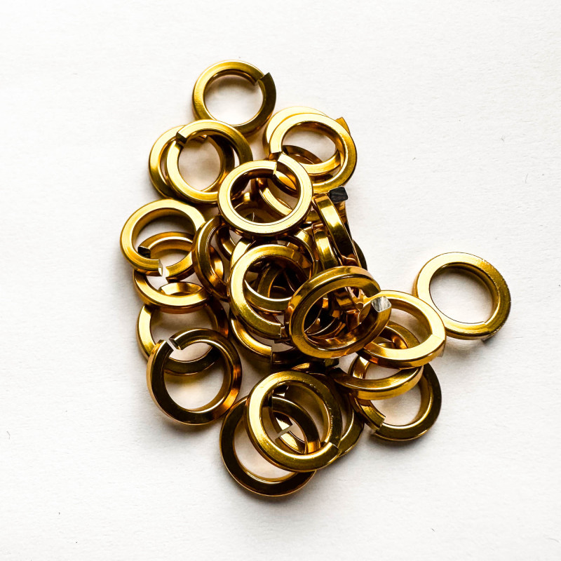 Spojovací kroužky z eloxovaného hliníku zlaté barvy. Řez drátem je čtvercový.