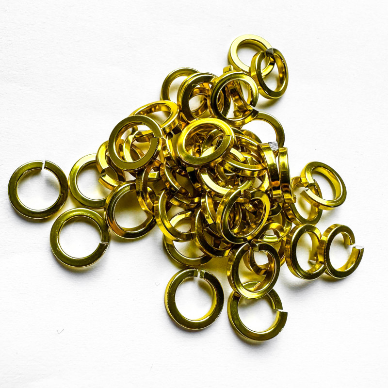 Spojovací kroužky z eloxovaného hliníku žluté barvy. Řez drátem je čtvercový. Tyto kroužky jsou velice lesklé a díky tvaru drátu se blýskají více než kroužky z klasického drátu.