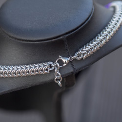 K zapínání slouží nerezová karabinka a prodlužovací řetízek.