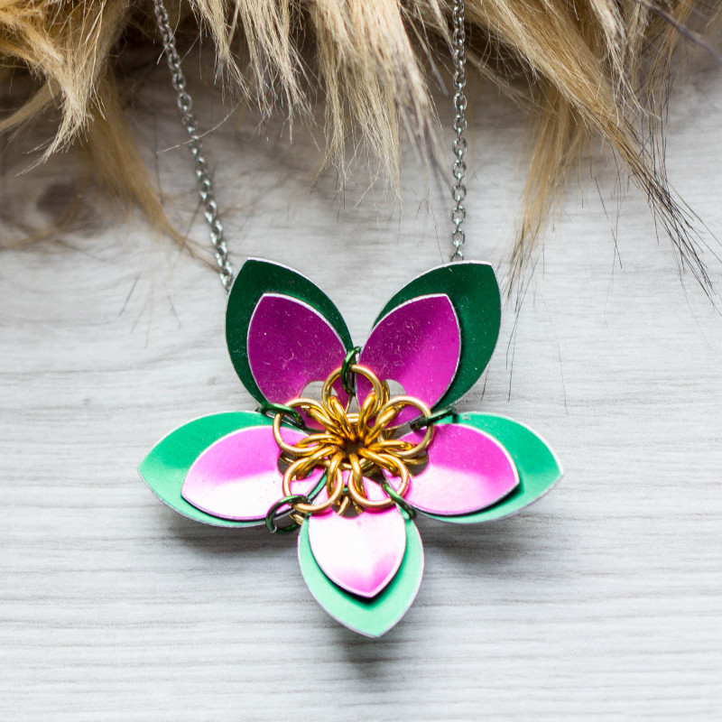 Náhrdelník jsem vyrobila. technikou kroužkování z eloxovaných hliníkových kroužků zlaté a zelené barvy, šupin zelené a růžové barvy, řetízku a komponentů z kvalitní chirurgické oceli.