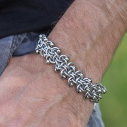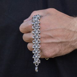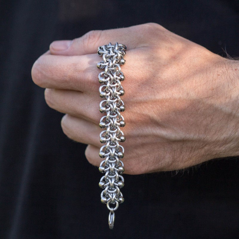 Tento složitý a přes to elegantní pánský náramek je vyroben eloxovaných kroužků světlé stříbrné barvy a doplněný korálky z chirurgické oceli.
