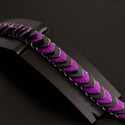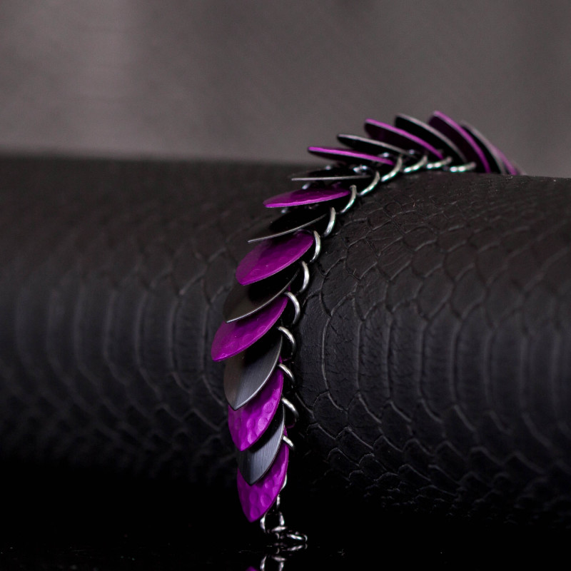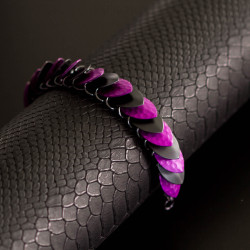 Tento náramek byl vytvořen z antracitových kroužků a matných šupin z eloxovaného hliníku. Použité šupiny jsou dvou barev. Hladké jsou antracitové a druhá barva, kterou si můžete zvolit, jsou šupiny s 3D strukturou.