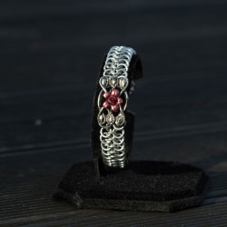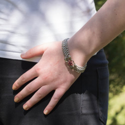 Střed náramku tvoří recyklovaný komponent, jehož materiál ani minulost nejsou známé. Jedná se patrně o slitinu kovů, zvrchu lakovaný barvami a doplněný skleněnými kamínky.