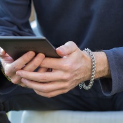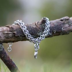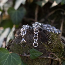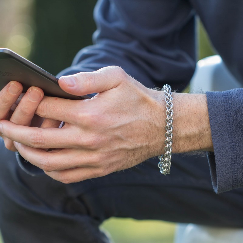 Náramek hodící se na pánskou i dámskou ruku je vytvořen eloxovaných kroužků stříbrné barvy.