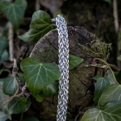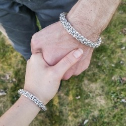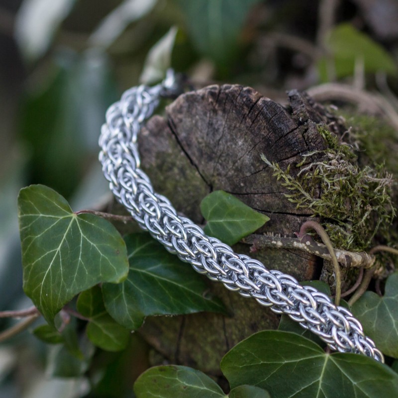 Náramek hodící se na pánskou i dámskou ruku je vytvořen eloxovaných kroužků světle stříbrné barvy.