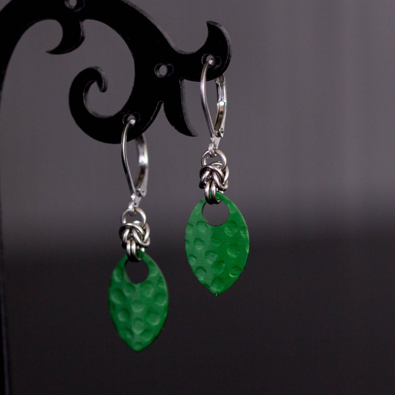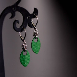 Náušnice jsem vyrobila z kroužků matných šupin z eloxovaného hliníku, které mají 3D strukturu.