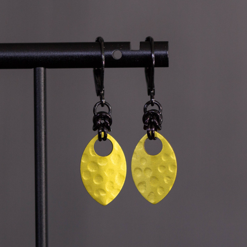 Náušnice jsem vyrobila z kroužků matných šupin z eloxovaného hliníku, které mají 3D strukturu.