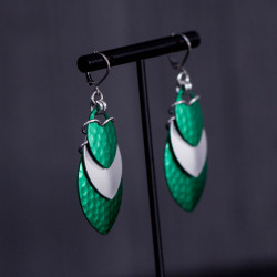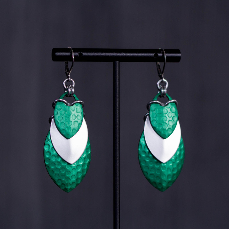Náušnice jsem vyrobila ze stříbrných eloxovaných hliníkových kroužků a matných šupin třech velikostí. Střední jsou matné stříbrné. Ostatní mají zelenou barvu a 3D strukturu.