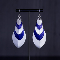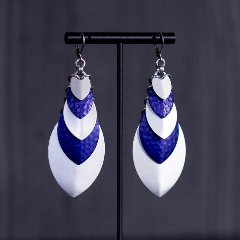Náušnice jsem vyrobila ze stříbrných eloxovaných hliníkových kroužků a matných šupin pěti velikostí. Střídají se matné stříbrné a kobaltově modré, které mají 3D strukturu.