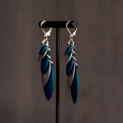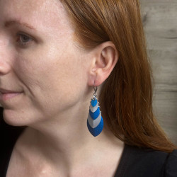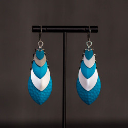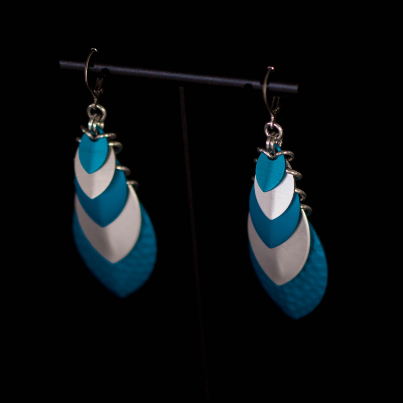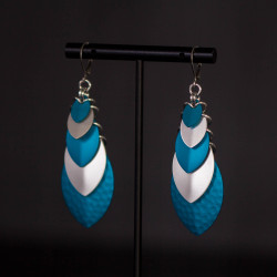 Náušnice jsem vyrobila ze stříbrných eloxovaných hliníkových kroužků a matných šupin pěti velikostí. Střídají se matné stříbrné a matné tyrkysově modré šupiny, ty největší mají 3D strukturu.