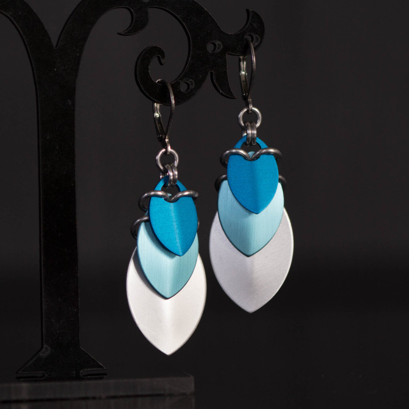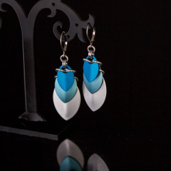 Náušnice jsem vyrobila ze stříbrných eloxovaných hliníkových kroužků a matných šupin tří velikostí. Zelené a žluté šupiny mají 3D strukturu.