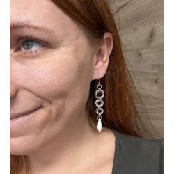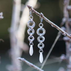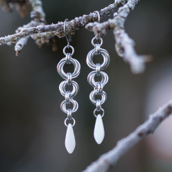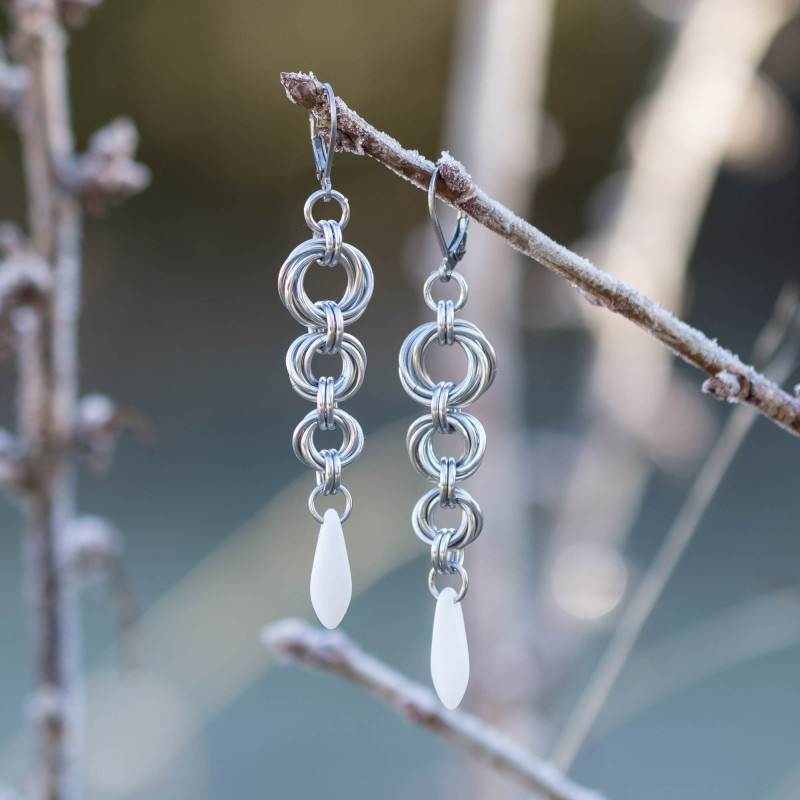 K výrobě těchto nejen náušnic jsem použila kroužky z eloxovaného hliníku stříbrné barvy, ledově bílé skleněné jazýčky od Rudkovski a komponenty z chirurgické oceli.