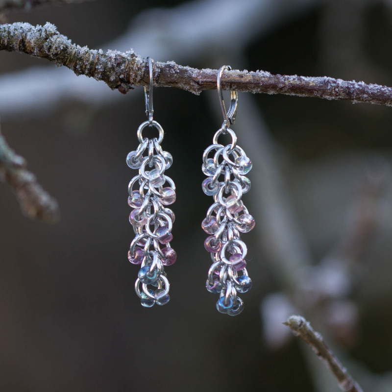 Zavěšeny jsou na háčcích z vysoce kvalitní chirurgické oceli. Díky tomu jsou vhodné i pro alergiky na kovy. (Pouze hnědo-barevná varianta náušnic je na hnědých bižuterních háčcích bez obsahu niklu.)