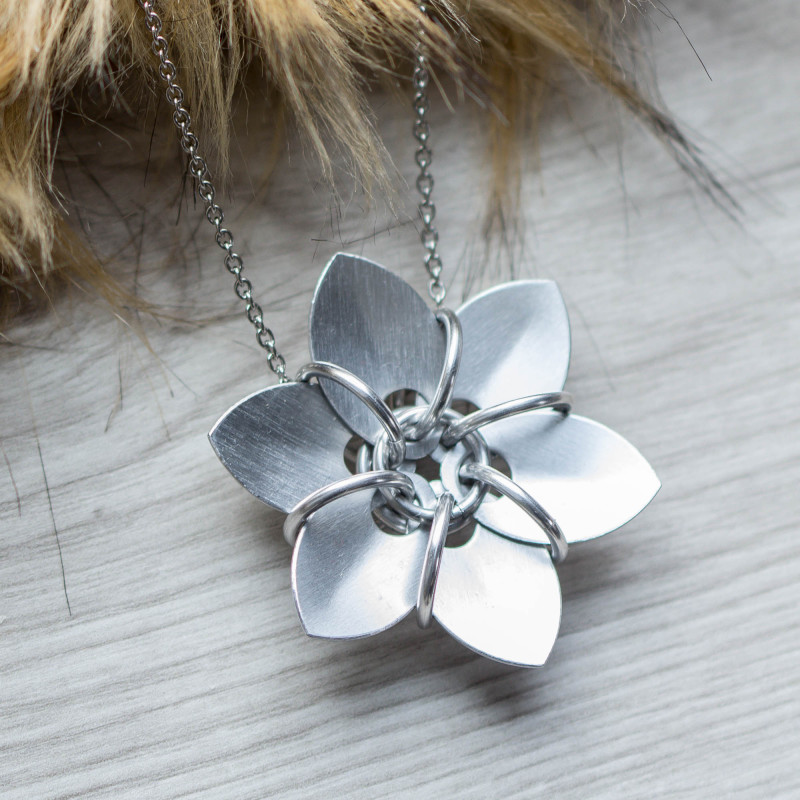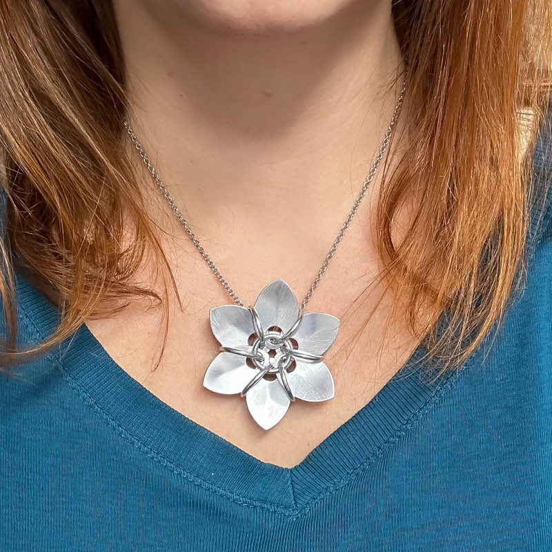 Je vytvořen z eloxovaných hliníkových kroužků a lesklých šupin stříbrné barvy.
