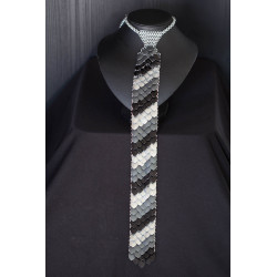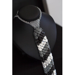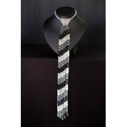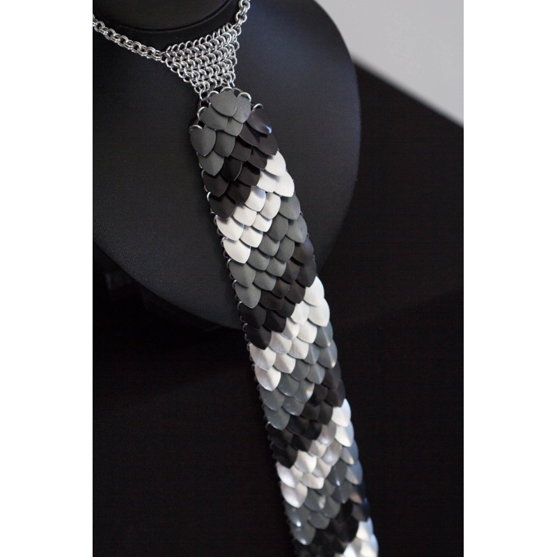 Je vyrobena ze stříbrných kroužků z eloxovaného hliníku a šupin stejného materiálu. Část kolem krku je z u kroužkovaného řetízku, který se zapíná na karabinku z nerezové oceli. Díky tomu kravata nezreziví nezčerná ani jinak nezmění svou barvu, ani když přijde do kontaktu s vodou. Je vhodná pro alergiky na kovy. I když je kravata kovová, nemusíte se bát, že by bylo její nošení nepohodlné. Je velice lehká.