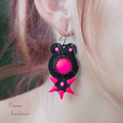 Tyto extravagantní náušnice byly vytvořeny technikou sutaškování neboli prýmkování v kombinaci s korálkovou výšivkou.