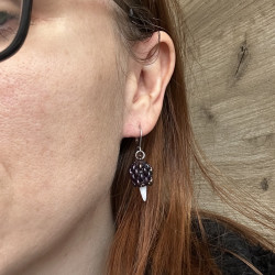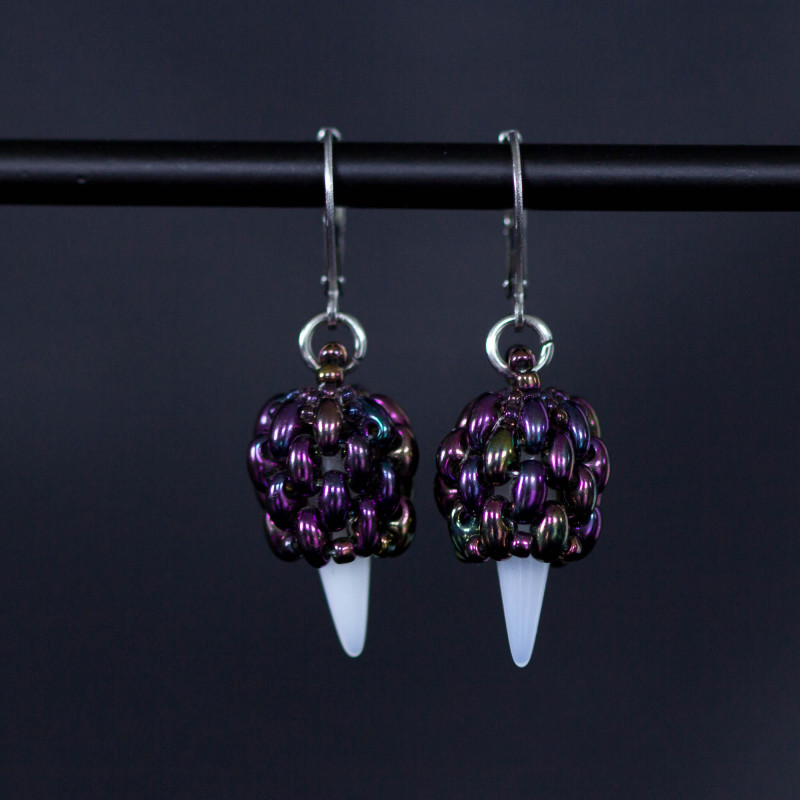 Tyto náušnice včelky jsem ušila z drobných tmavě fialových skleněných korálků s duhovým pokovem a bílých spiků.