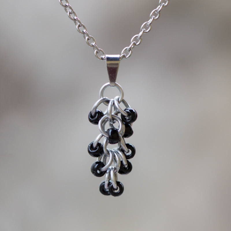 Přívěsek je vyrobený eloxovaných hliníkových kroužků stříbrné barvy a drobných skleněných korálků černé nebo červené barvy.