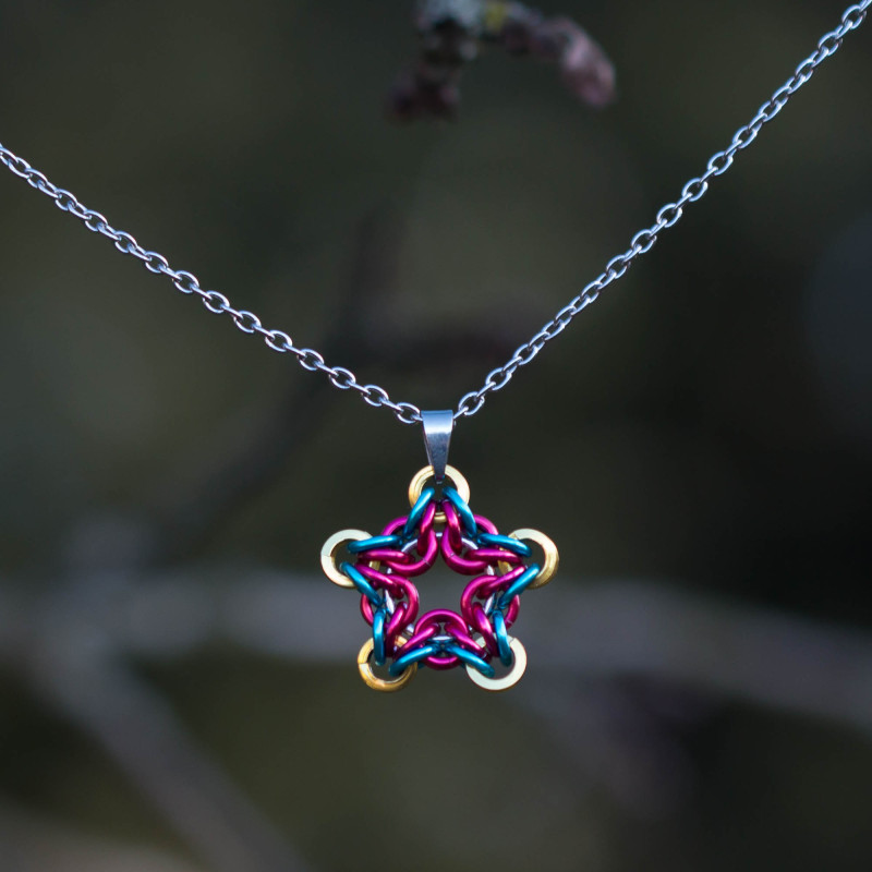 Přívěsek ve tvaru hvězdy je vytvořen z eloxovaných hliníkových kroužků zlaté, tyrkysové a růžové barvy.