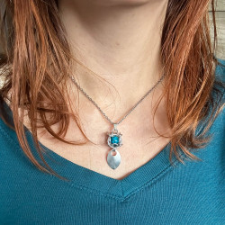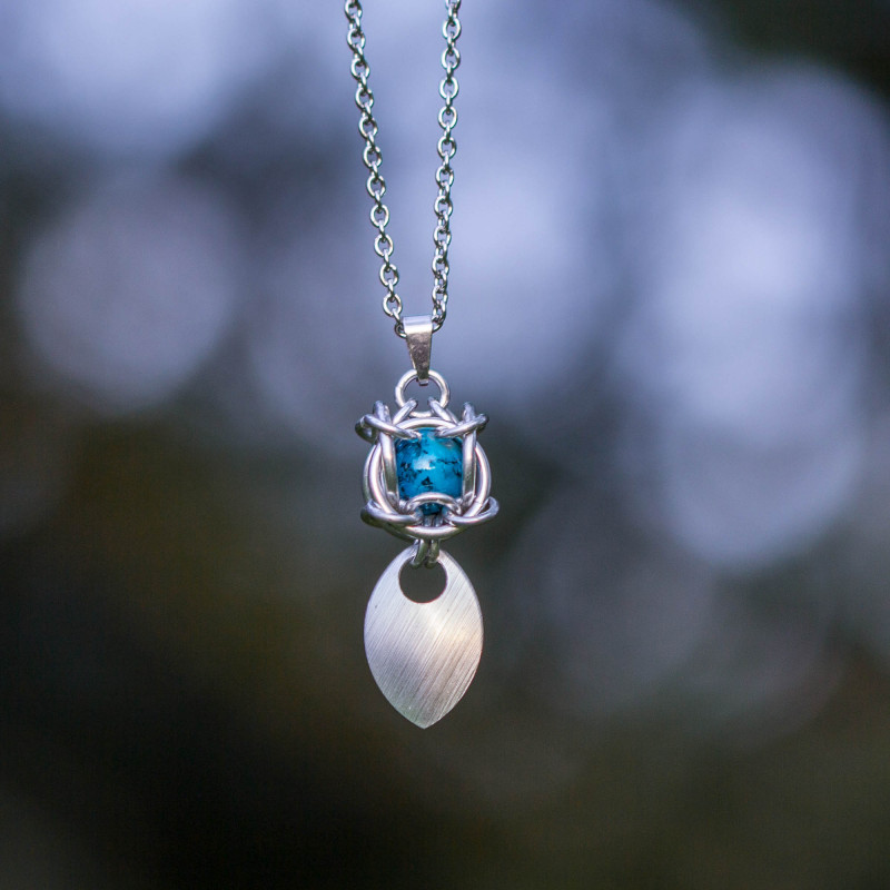 Přívěsek ve tvaru lucerničky je vyroben z eloxovaných hliníkových kroužků stříbrné barvy a stříbrné šupiny. Uvnitř lucerny je uvězněná tyrkysový batykovaný korálek, která se může občas pootočit a může být vidět její dírka..