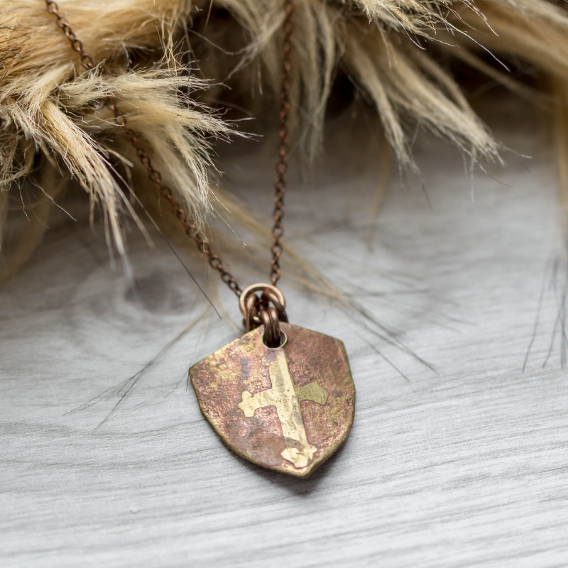 Přívěsek je vyroben z mosazno-měděných kovaných štítů a měděných kroužků. Na štítu je vyobrazený kříž.
